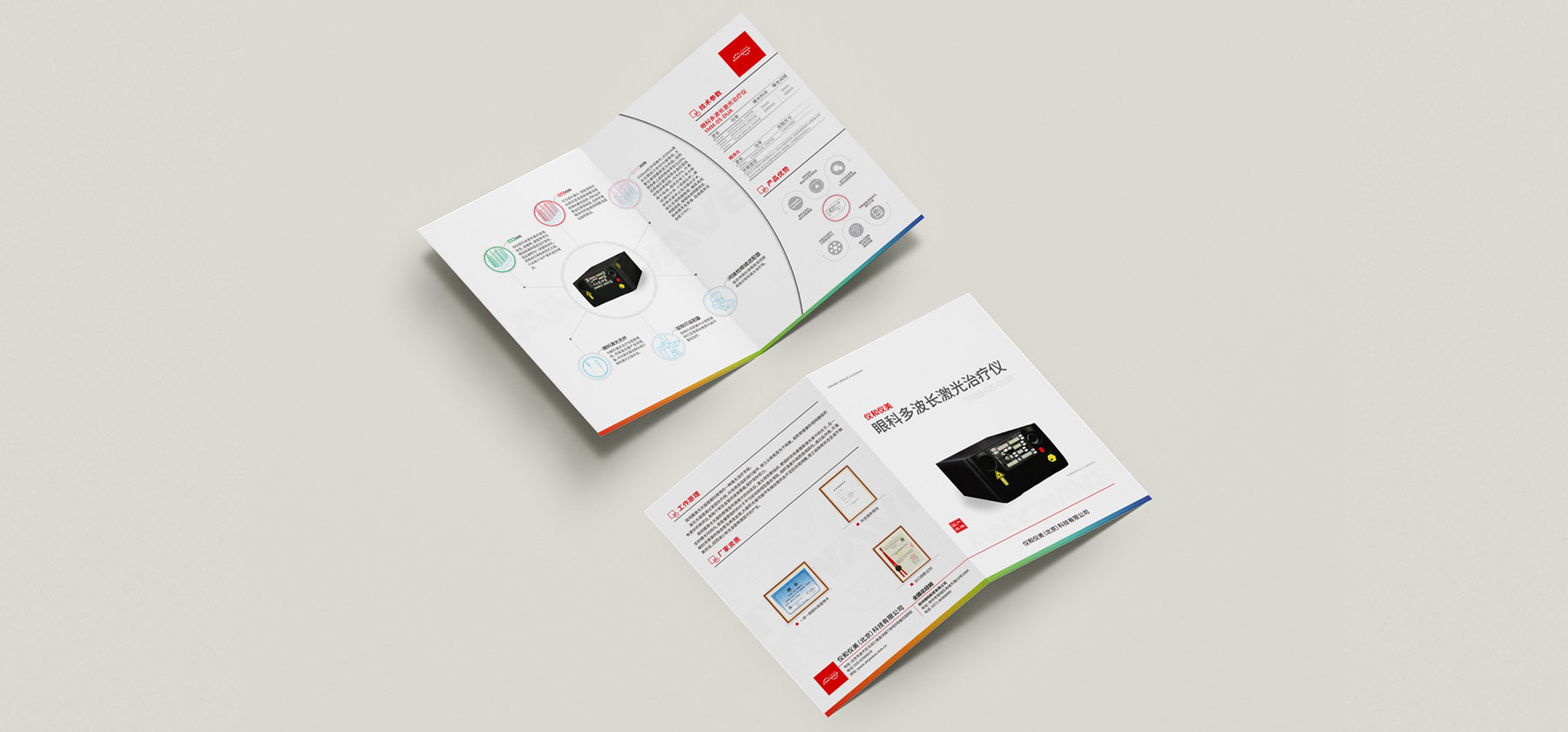該折頁(yè)設計采用了封面模切的工藝,鏤空之后透出底部logo的效果。對企業(yè)形象有個(gè)很好的展示效果。在整個(gè)畫(huà)面的展示中也體現出激光的重要性。